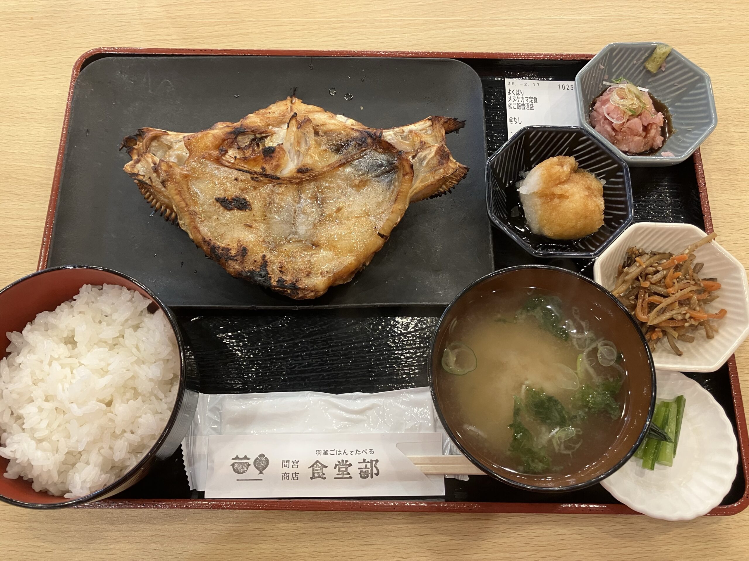 「よくばりメヌケカマ定食」。間宮商店食堂部ではひものを蒸気と熱風で下焼きした後600℃以上の溶岩焼で一気に表面を炙る事で余分な脂が落ち、旨みと程よい柔らかさ食欲をそそる香ばしさを備えた極上のひもの焼きを楽しめる。メヌケカマ定食は文字通り冬が旬のメヌケのカマをひものにしたものが焼かれている限定商品であまりお目にかかれない一品。骨が多くなかなかに食しにくい部位ではあるがプリプリのメヌケ特有の食感と、もちーっとしたカマ部分特有の食感が混在していて大変味わい深い。塩味がしっかりと付いているが付属の大根おろしと合わせても〇。毎朝羽釜で炊きあげているという白米が進む進む。お値段は2000円ちょっとと決して安くないが焼魚が好きな人は抑えておきたい逸品。