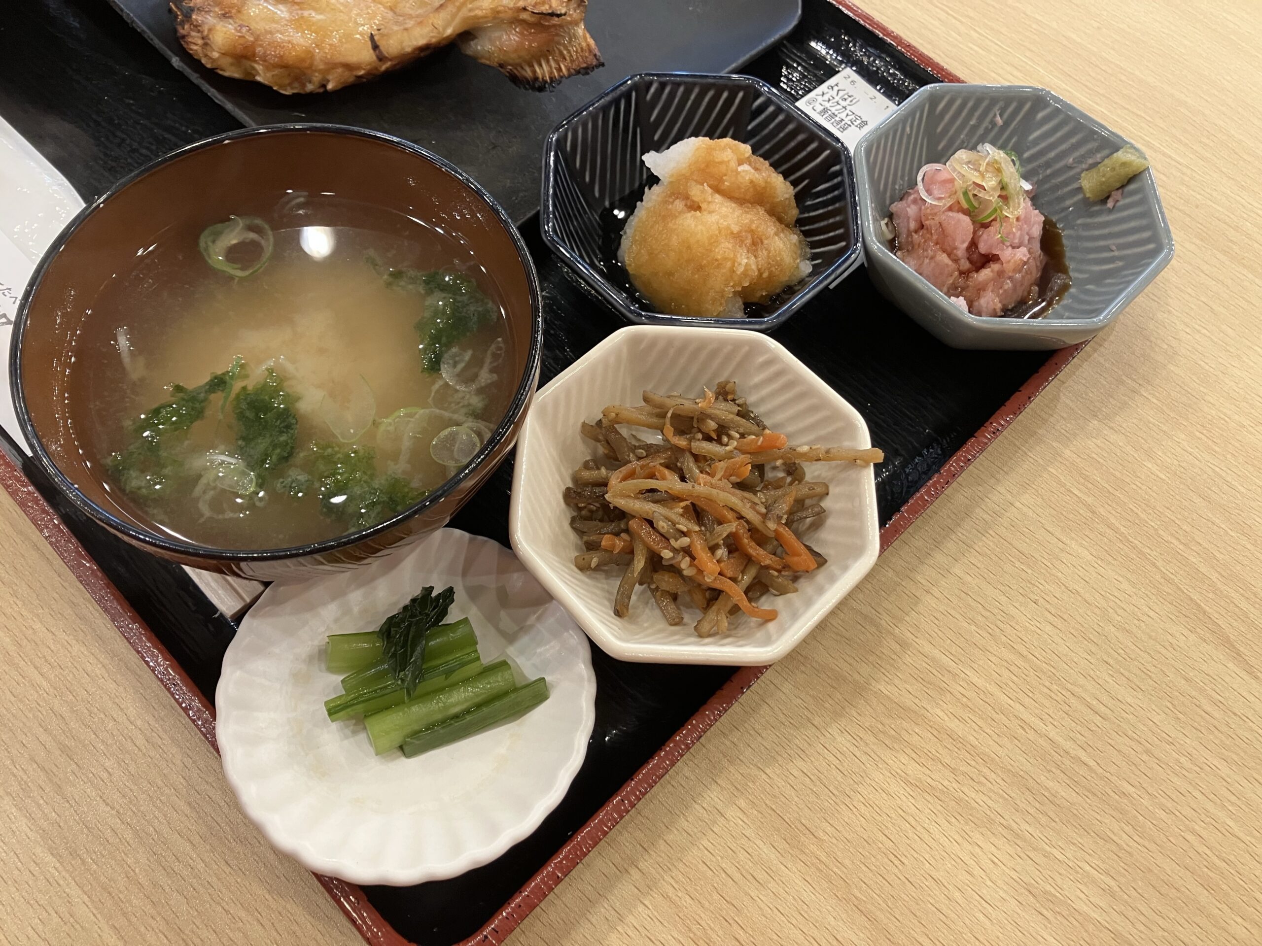 メヌケカマとご飯、大根おろしの他にアオサの味噌汁、野沢菜の漬物、きんぴらごぼう、本まぐろ入りのネギトロが付属する。味噌汁は味噌の塩分よりだし感が強い。ネギトロの味わいは申し分無し。その気になればこれだけでご飯1杯はすぐに消えて無くなる。