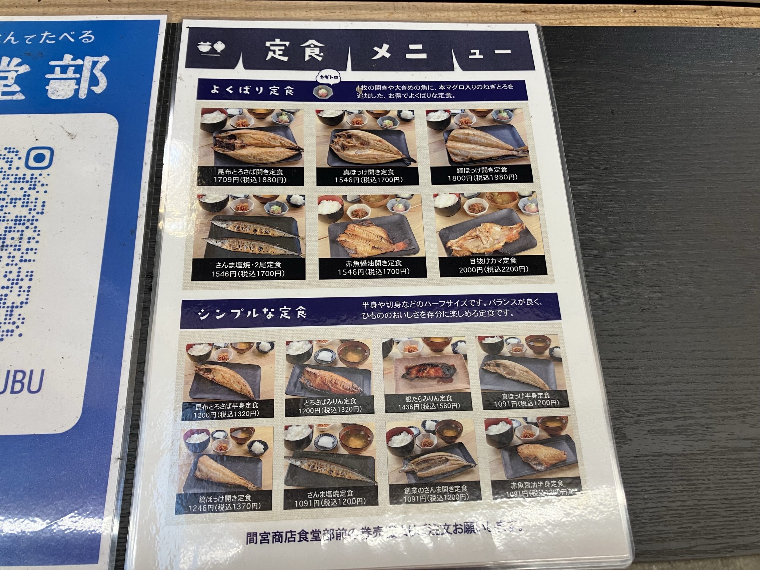 メニュー表。大分類は大きめの焼物に本まぐろ入りネギトロの付くよくばり定食と焼物の量が控えめでネギトロが付かないシンプルな定食の2種類。さんま塩焼き定食と創業のさんま開き定食、赤魚醤油半身定食が税込1200円で最安値なのでなかなかいいお値段ではあるが油を落としつつふっくらと焼き上げてある焼き魚は満足度高し。メニュー詳細は間宮商店 食堂部公式サイトをご確認下さい。