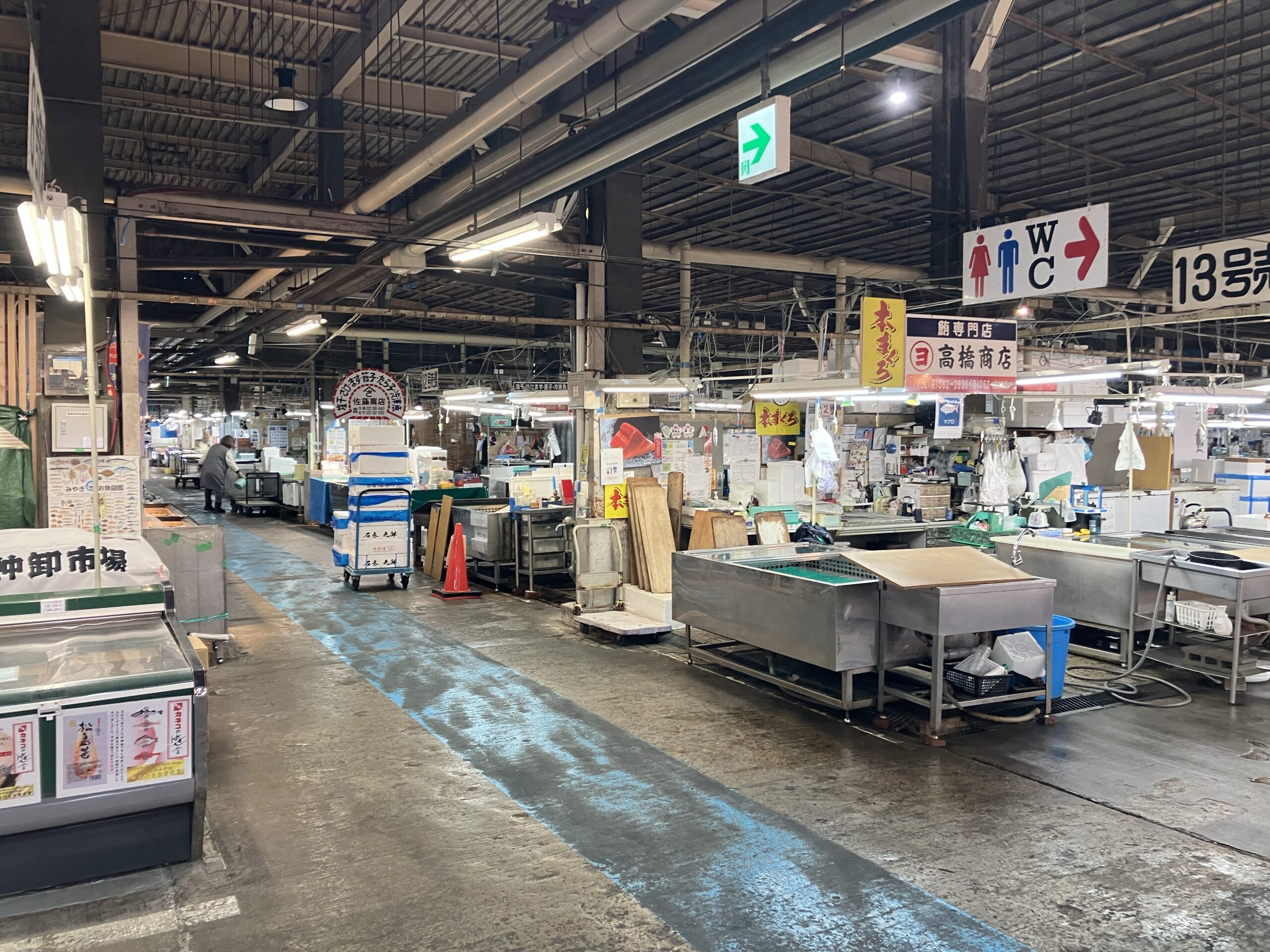 朝6時から営業している塩釜水産物仲卸市場は平日13時、土・日・祝日は14時まで営業中となっているが12時くらいに訪問すると写真の様にもう商店は軒並み閉店している。しかし間宮商店 食堂部やだし廊の様な飲食店は結構閉店ギリギリまで営業していて12時頃だと客足もまばらな為悠々とお昼ご飯を楽しむ事が可能。しかし12時~12時半頃には飲食店も落ち着いた所から閉店していたのでお昼ご飯の狙い目は11時頃と思われる。