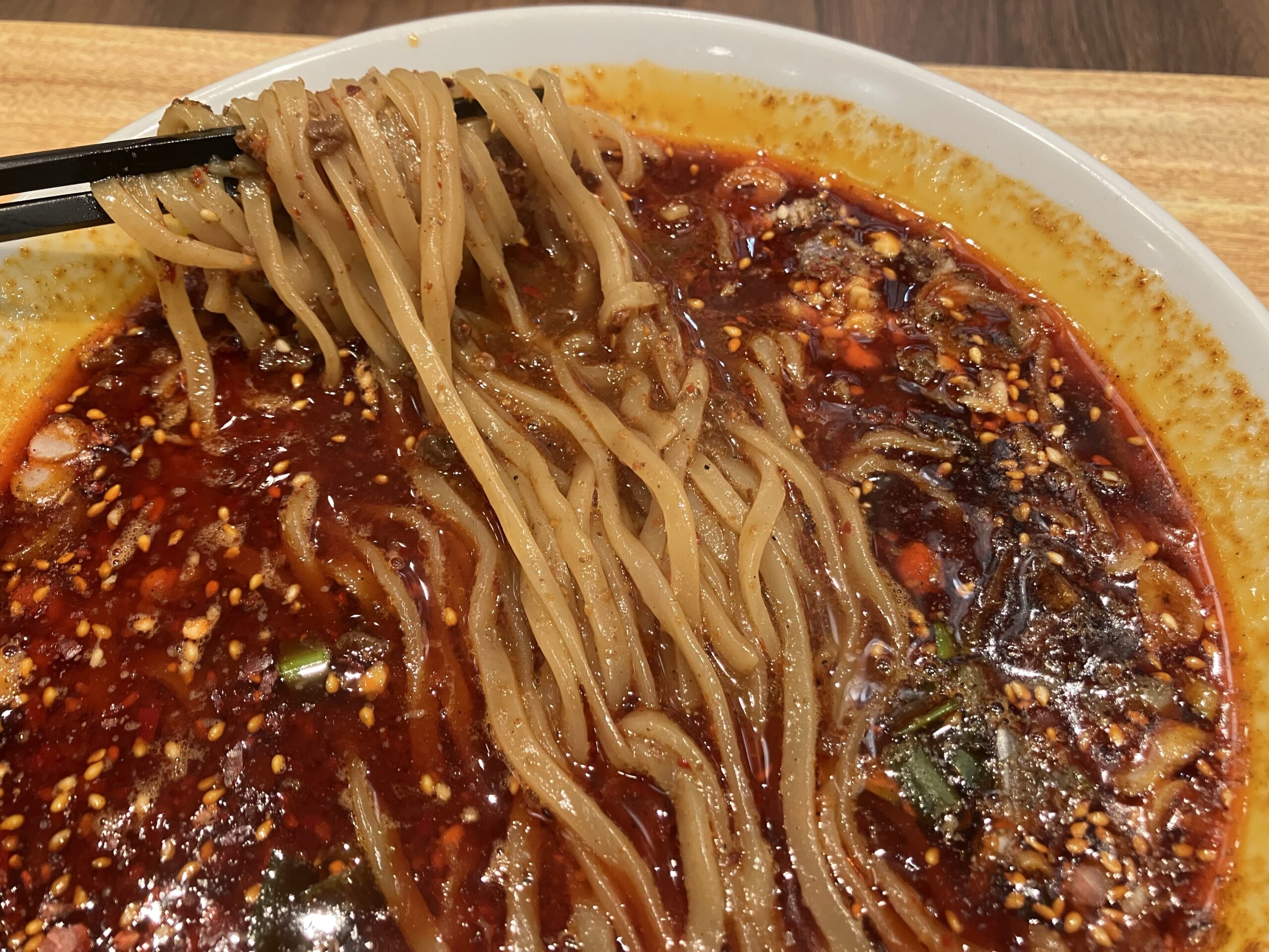 そんな紅虎餃子房の激辛メニューである紅麻辣担々麺。作る人や時期によって辛さが変わるこの担々麺は前々々回が「激辛ではなくしっかり辛い」、前々回が「かなりの激辛」、前回が「ほどよく激辛」な辛さだった。今回は前回より辛く前々回よりは辛くない「しっかり激辛」な印象。やはり作り手や紅虎餃子房の店舗によって同じ紅麻辣担々麺でも辛さに違いが有る様子。紅麻辣担々麺の塩加減は塩梅良く、辛さの奥にある元のスープはさっぱりとしていて食しやすいが今回も当然の様にお子様や辛いものが苦手な方は食せない攻撃力があり痺れもそこに加わっている。