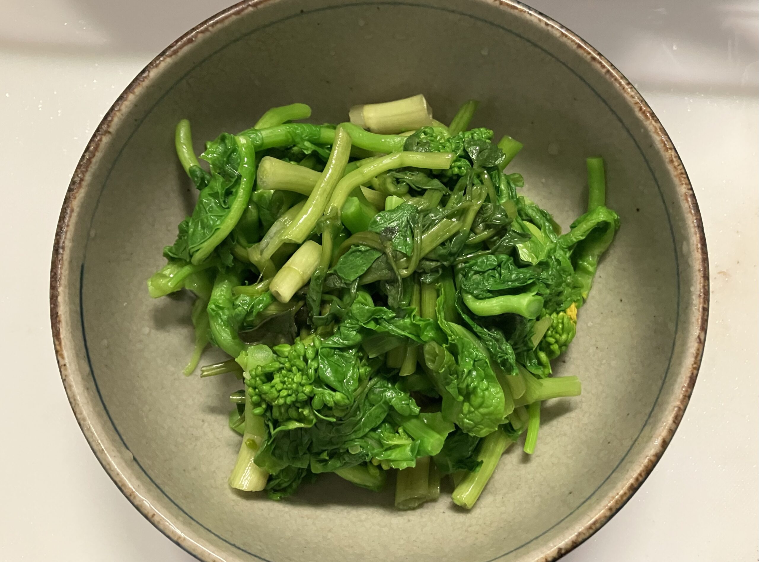 これで完成。セリと菜の花は(新鮮であれば)共に生食可能なので本当にササっとお湯を潜らせる位に煮るのが美味しさのポイント。後はたっぷり鰹節をかけて…
