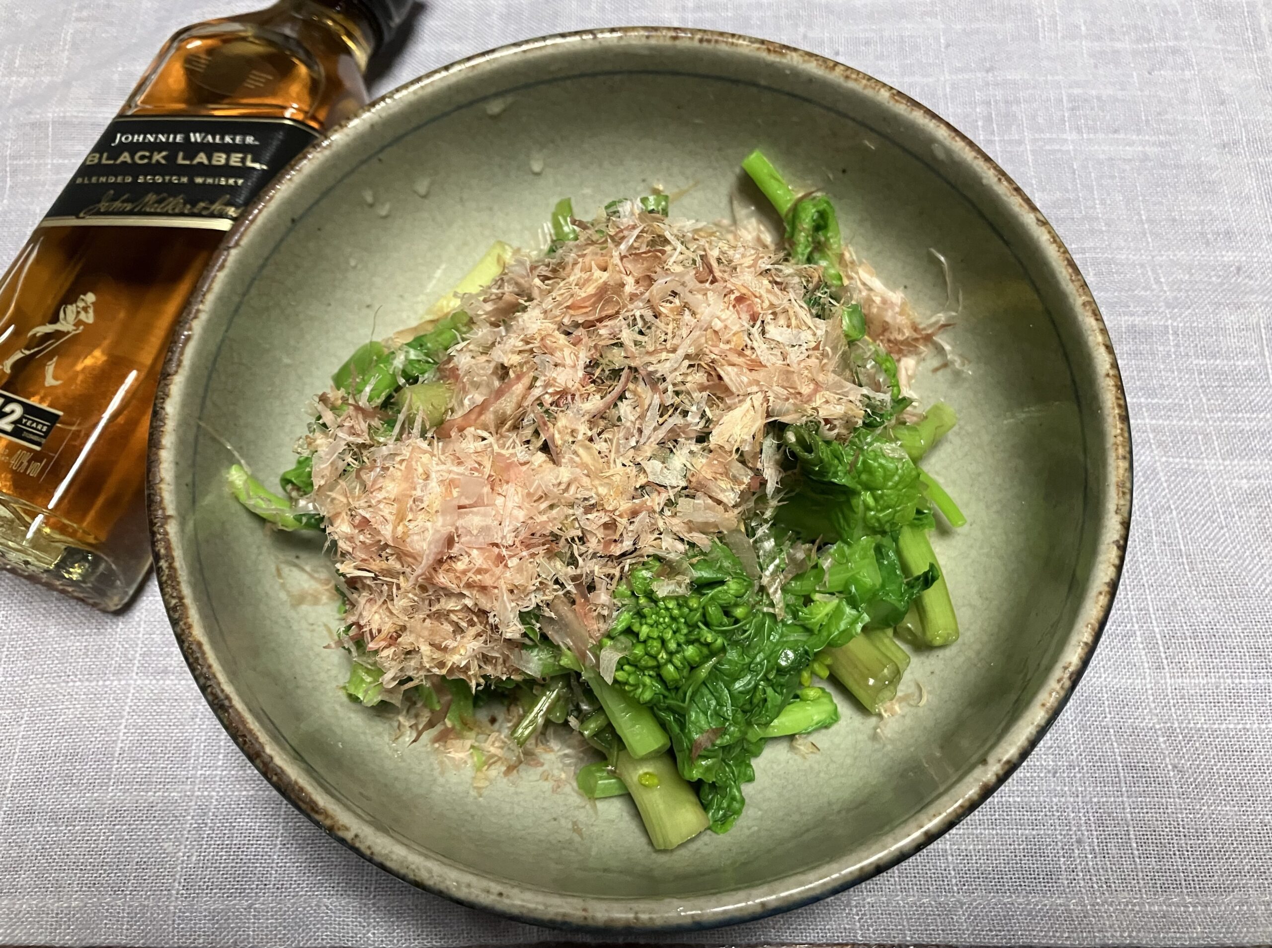 これで完成。醤油、だし醤油で頂いても美味しいがわたしのお勧めは味ぽん。セリ独特の香りとシャキシャキ感、菜の花のほろ苦さが相まって滅茶苦茶に酒が進む大人のお浸し。この時期はこれだけワシワシ食べていたいくらい好きな料理でこの日はジョニ黒のハイボールをグビグビ頂きながら摘まみほろ酔いに。