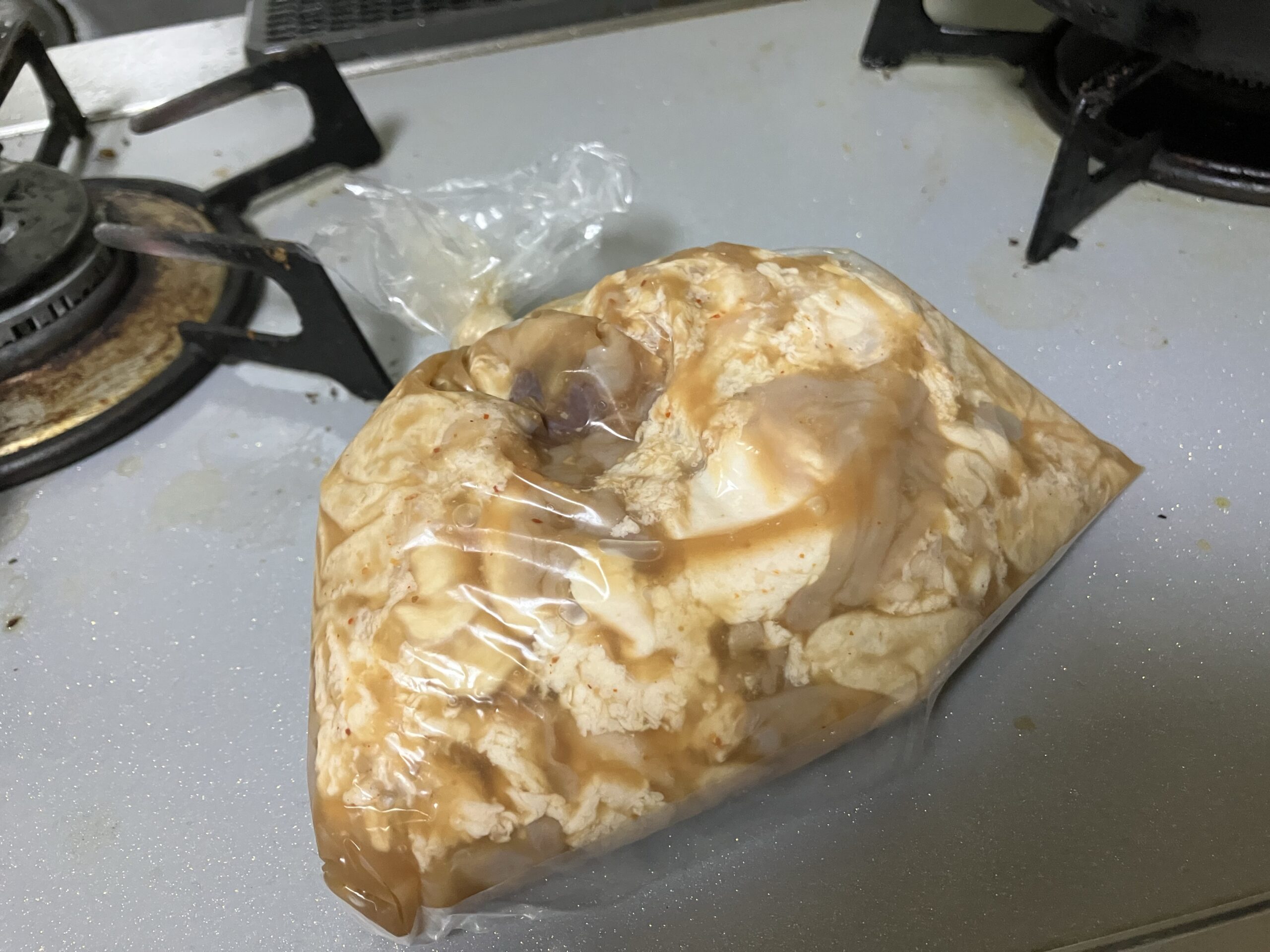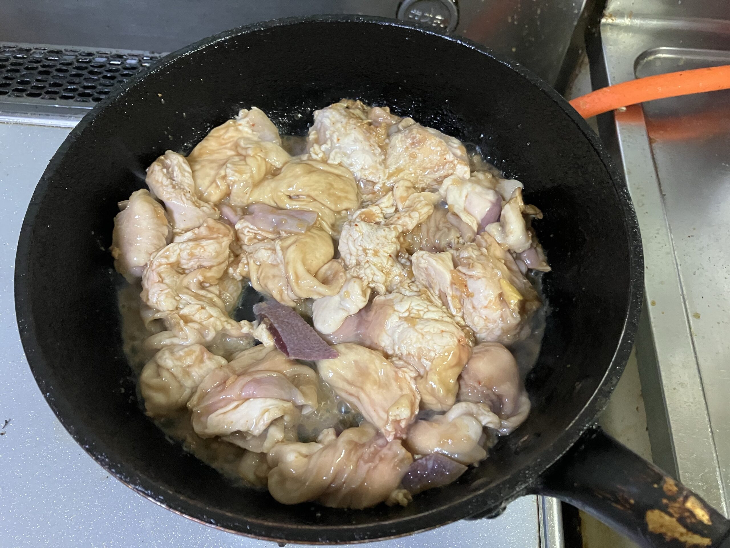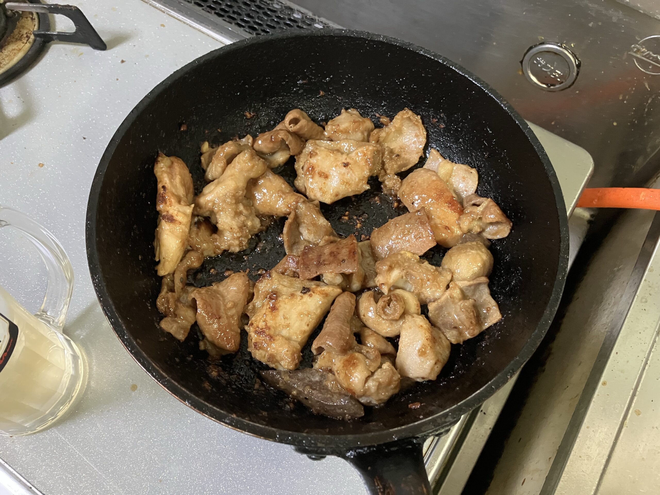 そんな豚味付ホルモンの調理方法は非常に簡単で、フライパンにぶち込んで煮詰める様にホルモンを焼いていくだけ。以前網焼きにしたことがあるがタレを落としてしまうと薄味になってしまいイマイチだった。ガンガン強火で焼いてホルモンにタレを染み込ませていく。当然のように油跳ねが物凄いので終わった後は掃除を前提に調理して下さい笑。余談だがキッチンが汚れてくるとこのホルモンを焼いてとどめを刺し、ガッツリキッチン掃除を行うというしきたりがおよ家にはある笑。そのためコンロやキッチンが汚れているのはご勘弁下さい、この後しっかりふきふきしましたので。