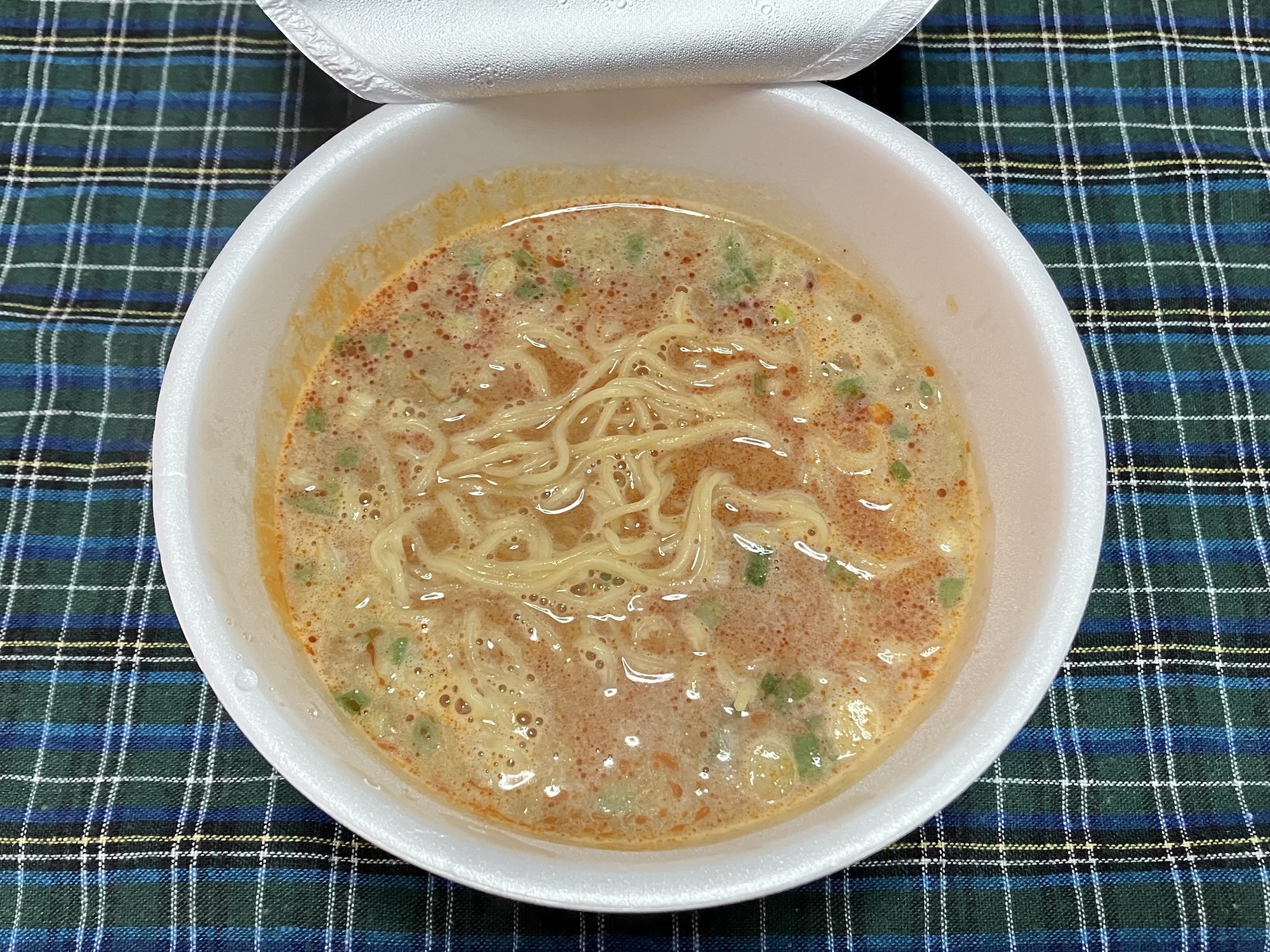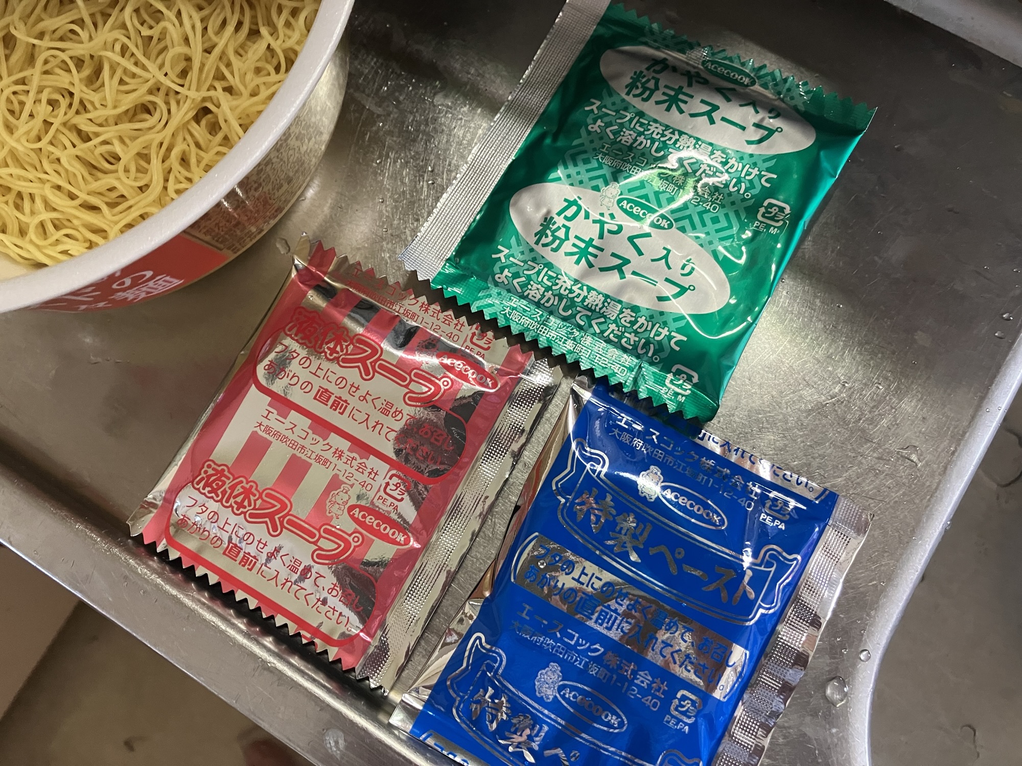 開封すると小袋が3つ入っている。そのうち先入れしてお湯をかけるのは緑の袋のみ。赤と青の袋は蓋の上に載せて温めろとの指示だが青の特製ペースト、白ゴマのペーストは蓋の上で温めたくらいでは溶けてくれないので注意。お湯を入れて5分待つ。